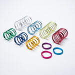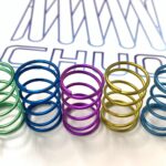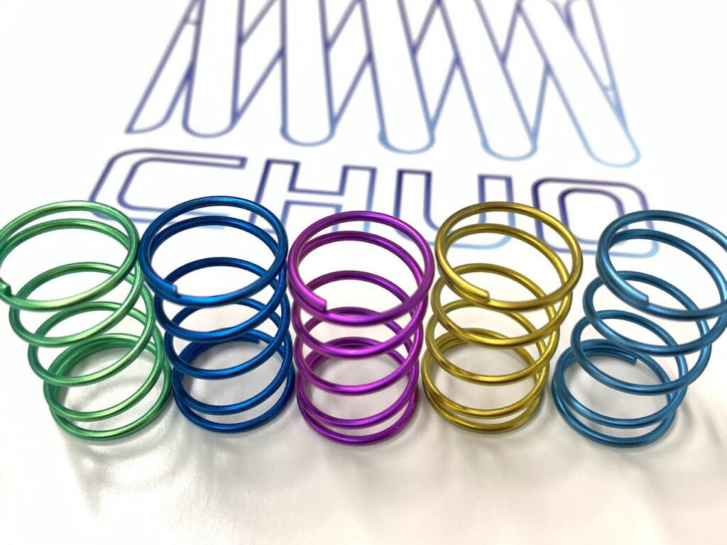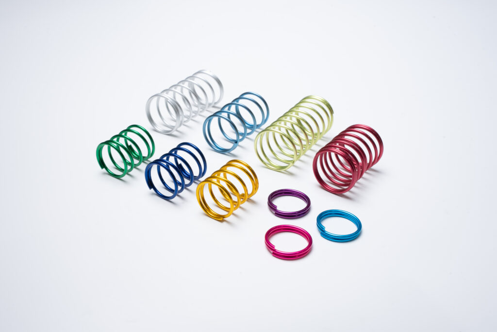 アルミ合金材を圧縮コイル形状へ成型し、アルマイト処理をすることでカラフルにしました♪SUS材に比べ、力の弱いばねができます。軽量・非磁性・軽荷重の用途で、ばね指数(D/d)が大きくばね加工が困難とされてきた製品の代替えにオススメです。比較的やわらかい荷重特性を実現できる点が特徴です。キーホルダーや日用品などにも使用されています。